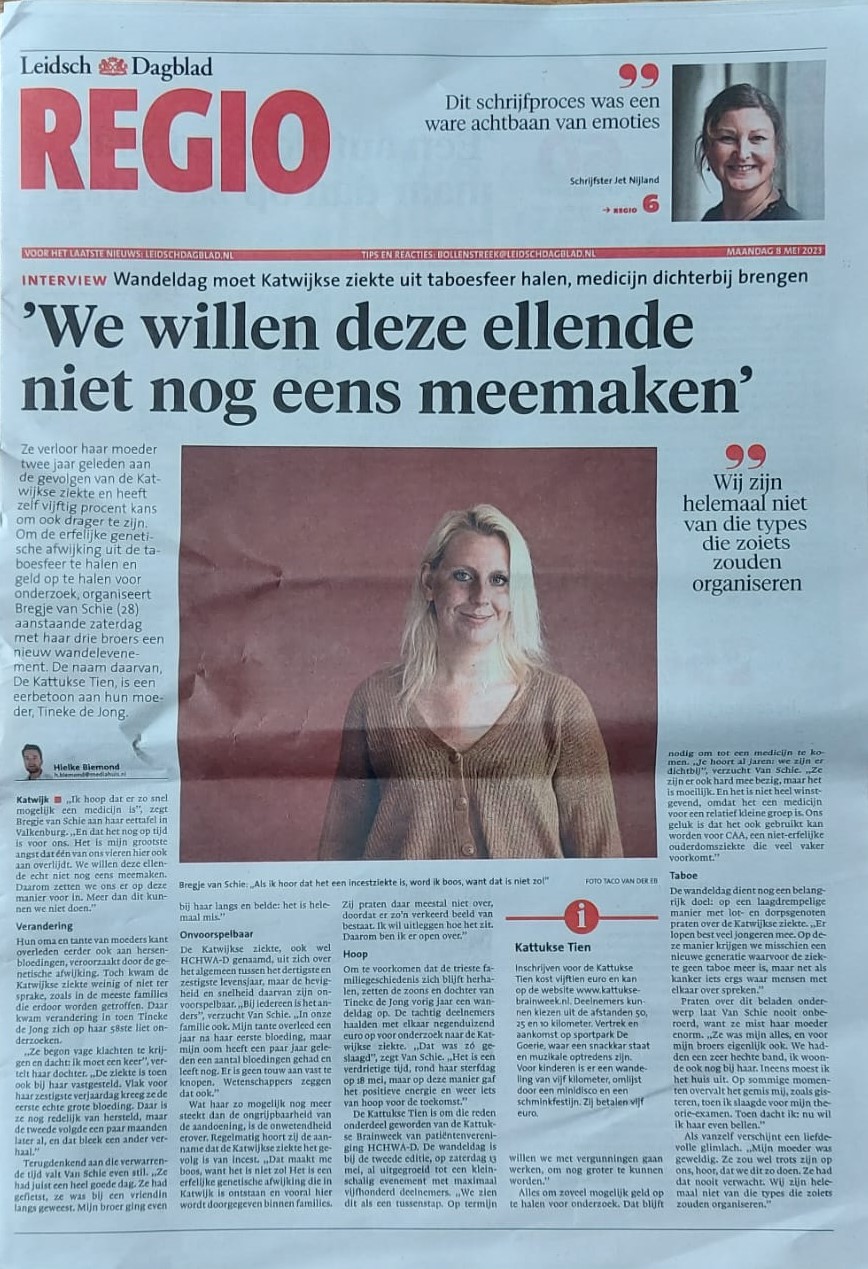 De vrijdag vóór de wandeling stond Bregje van Schie paginagroot in de regiokrant van het Leidsch Dagblad. In het artikel vertelt zij over waarom zij en haar familie het initiatief namen tot de tocht. Zij verloren in 2021 hun moeder Tineke aan een hersenbloeding en dat was voor haar en haar broers de aanzet om geld op te halen voor onderzoek naar de ziekte. Haar verhaal leest u hier. Geen abonnee? Dan vindt u hier een afbeelding van het bericht.