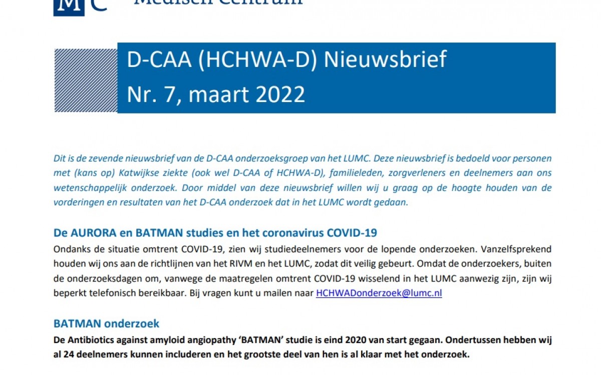 Het onderzoeksteam in het LUMC publiceert tweemaal per jaar een uitgebreide nieuwsbrief over de stand van zaken in het onderzoek naar HCHWA-D. In deze nieuwsbrief vindt u o.a. informatie over AURORA, de toegevoegde slaaponderdelen, de nieuwe studie CARE en de promotie van Ellis van Etten. Hier kunt u de nieuwsbrief openen. Als u deze per mail wilt ontvangen, kunt u zich opgeven via hchwadstamboom@lumc.nl.